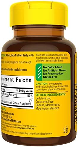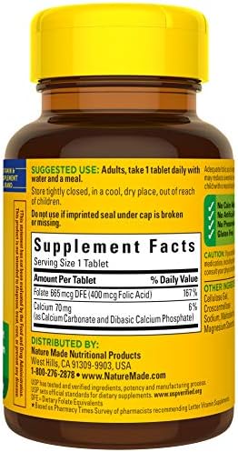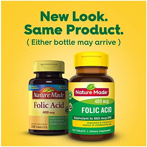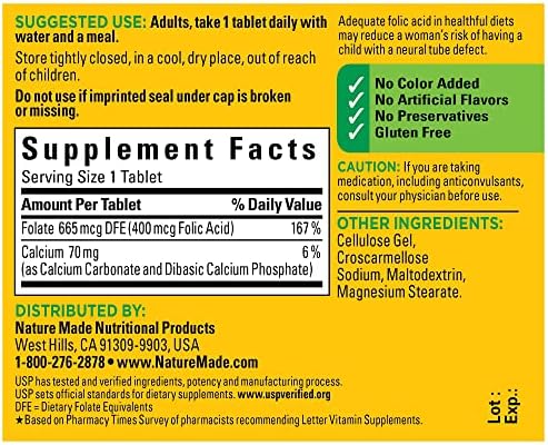 Nature Made Folic Acid 400 mcg contains an important B vitamin for women of childbearing age and pregnant women. This gluten free Folic Acid supplement has no color added, no artificial flavors and no preservatives. Folic acid, also known as folate from dietary sources, helps support nervous system function. This folate supplement also plays a critical role in the proper development of the baby’s nervous system. Adequate Folic Acid in healthful diets also may reduce a woman’s risk of having a child with a neural tube defect. Adults take one of these Folic Acid dietary supplement tablets daily with water and a meal. Nature Made supplements are quality you can trust. USP has tested and verified ingredients, potency and manufacturing process. USP sets official standards for dietary supplements. Visit the USP verified website for more information. *Based on a survey of pharmacists who recommend branded vitamins and supplements.