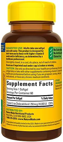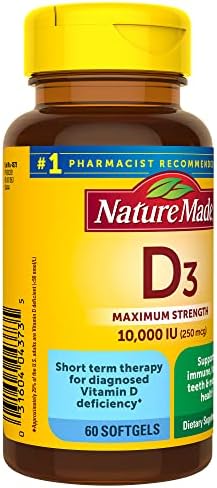 Nature Made Maximum Strength Vitamin D3 10000 IU Softgels (250 mcg) offer an easy way to add Vitamin D supplements to your daily routine to support bone, teeth, muscle, and immune health. Sourced from high quality ingredients, these Nature Made Vitamin D softgels are gluten free dietary supplements with no color added and no artificial flavors. Each Vitamin D3 10000IU softgel supports a healthy immune response and aids in calcium absorption. Vitamin D is a common nutrient shortfall. D3 vitamin is the body’s preferred form of Vitamin D to help maintain Vit D levels. These maximum strength Nature Made Vitamin D3 supplements contain 250mcg (10000 IU) of Vit D3, and are designed for short-term use by those with higher Vitamin D needs and/or deficiency, as determined by a healthcare professional (1). Adults, take one Vitamin D3 Nature Made softgel daily with water. This Nature Made Vitamin D supplement is quality you can trust. (1)Approximately 29% of U.S. adults are Vitamin D deficient (<50 nmol/L) *Based on a survey of pharmacists who recommend branded vitamins and supplements.