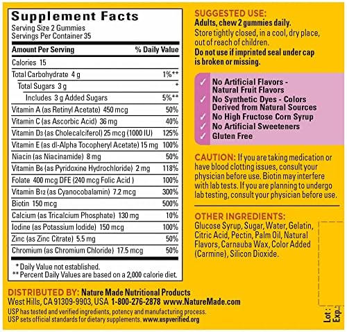 Nature Made Multivitamin For Her Gummies help support bone health, muscle health, immune health, and energy metabolism(1). Made in the USA wth quality global ingredients, these Nature Made multivitamin gummies for women are gluten free and contain no artificial flavors, no synthetic dyes, no high fructose corn syrup, and no artificial sweeteners. This Nature Made multivitamin for women is a dietary supplement that provides key nutrients to help support women’s health, including Folic Acid, B Vitamins, Vitamin A, Vitamin C, Vitamin D3, Vitamin E, Zinc, and Calcium. Available in strawberry with other natural flavors, this delicious and easy-to-take multivitamin supplement for women is perfect for those looking to help support their daily nutritional intake. Adults, chew two Nature Made women’s multivitamin gummies daily. Nature Made supplements are quality you can trust. USP has tested and verified ingredients, potency, and manufacturing process. USP sets official standards for dietary supplements. Visit the USP verified website for more information. (1)Helps convert food into cellular energy.