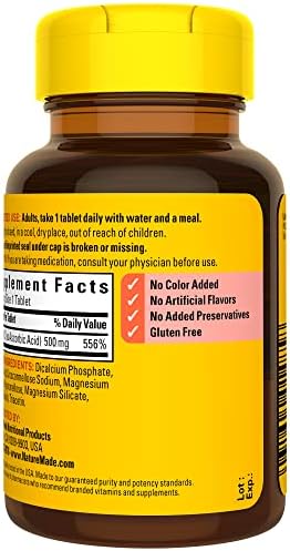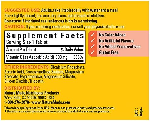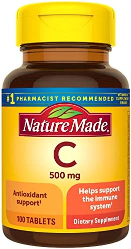 Nature Made Vitamin C 500 mg is a dietary supplement that supports immune health, provides antioxidant support, and aids in iron absorption. Sourced from high-quality ingredients, this gluten free Vitamin C for adults antioxidant supplement has no color added, no artificial flavors, and no added preservatives. Vitamin C is not only an antioxidant that helps support your immune system, but it is also needed for collagen synthesis to support overall skin health. If you are not receiving enough Vitamin C from your daily diet, then this 500mg Vitamin C supplement can help. Adults take one Nature Made 500 mg Vitamin C tablet daily with water and a meal. Nature Made supplements are quality you can trust. *Based on a survey of pharmacists who recommend branded vitamins and supplements.