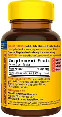 These Nature Made Vitamin C tablets 500 mg are gluten free antioxidant supplements that have no color added, no artificial flavors, and no added preservatives
