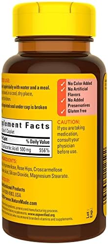 Nature Made Vitamin C 500 mg with Rose Hips Caplets is a dietary supplement that supports immune health, provides antioxidant support, and aids in iron absorption. Sourced from high-quality ingredients, these gluten free 500 mg Vitamin C caplets are an antioxidant supplement that has no color added, no artificial flavors and no added preservatives. Vitamin C is not only an antioxidant that helps support your immune system, but it is also needed for collagen synthesis to support overall skin health. If you are not receiving enough Vitamin C from your daily diet or taking a Vitamin C supplement, then these Nature Made Vitamin C 500mg caplets can help. Adults, take one of these Nature Made Vitamin C caplets 500 mg daily with water and a meal. Nature Made Vitamin C with Rose Hips supplements are quality you can trust. USP has tested and verified ingredients, potency, and manufacturing process. USP sets official standards for dietary supplements. Visit the USP verified website for more information. *Based on a survey of pharmacists who recommend branded vitamins and supplements.