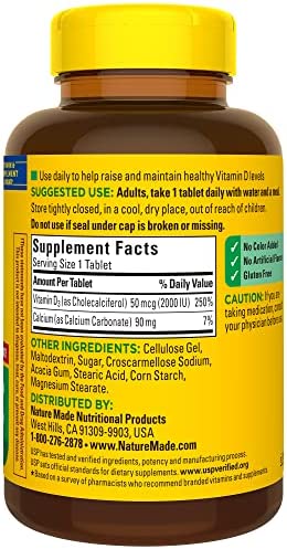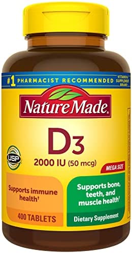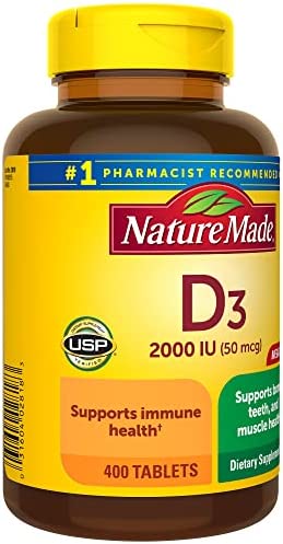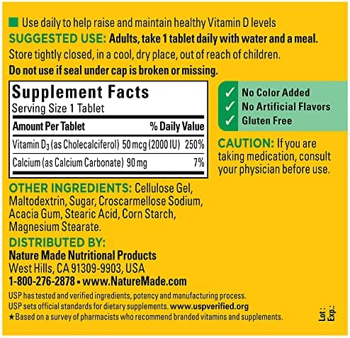 Nature Made Vitamin D3 2000 IU Tablets (50 mcg) offer an easy way to add Vitamin D supplements to your daily routine to support bone, teeth and muscle health. Sourced from high quality ingredients, these Nature Made Vitamin D tablets are gluten free dietary supplements with no color added and no artificial flavors. Each Vitamin D3 2000IU tablet supports a healthy immune response and aids in calcium absorption. Vitamin D is a common nutrient shortfall. D3 vitamin is the body’s preferred form of Vitamin D to help maintain Vit D levels. These Nature Made Vitamin D3 supplements contain 50mcg (2000 IU) of Vit D3 per serving. Adults, take one Vitamin D3 Nature Made tablet daily with water and a meal. This Nature Made Vitamin D supplement is quality you can trust. USP has tested and verified ingredients, potency and manufacturing process. USP sets official standards for dietary supplements. Visit the USP verified website for more information. *Based on a survey of pharmacists who recommend branded vitamins and supplements.