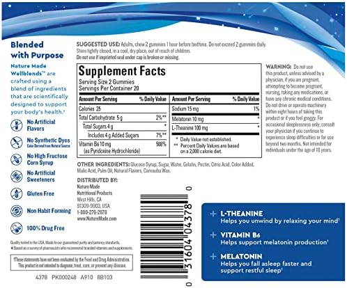 NATURE MADE WELLBLENDS: This supplement that helps support sleeping well blends Melatonin 10mg with L Theanine 100 mg and Vitamin B6 for restful sleep support