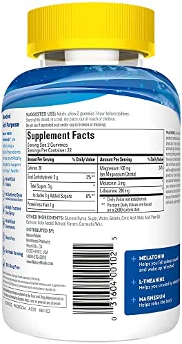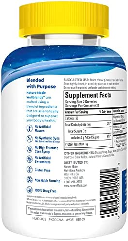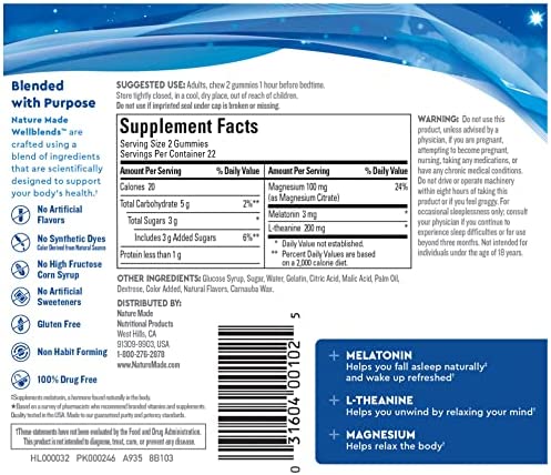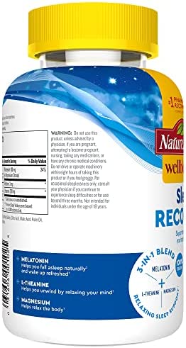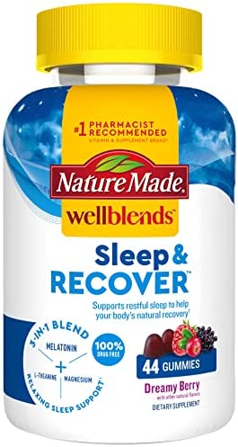 Nature Made Wellblends Sleep & Recover Gummies are a scientifically designed 3-in-1 blend with ingredients to provide relaxing sleep support. This 100% drug free sleep aid combines Melatonin 3mg with L-theanine and Magnesium to support your restful sleep and help your body’s natural recovery. Melatonin helps you fall asleep and wake up refreshed. L theanine helps you unwind by relaxing your mind, and Magnesium helps relax the body. All of that support in just two delicious Dreamy Berry flavored gummies. Give your body the relaxing sleep support it needs, with Nature Made Wellblends Sleep & Recover Gummies. For other sleep supplements, try our Nature Made Wellblends sleep aids for adults extra strength, sleep gummies for adults, and more. *Based on a survey of pharmacists who recommend branded vitamins and supplements.