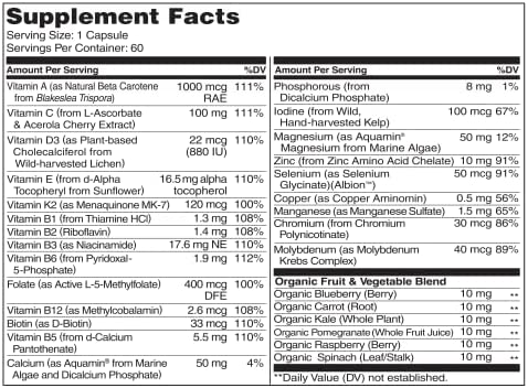 Plant-Based: Featuring premium plant-based vitamins and minerals including as Vitamin D3 from lichen, Vitamin E from sunflower, plant Calcium and Magnesium from marine algae, and Iodine from kelp.