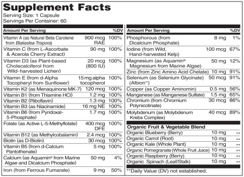 Plant-Based: Featuring premium plant-based vitamins and minerals including as Vitamin D3 from lichen, Vitamin E from sunflower, plant Calcium and Magnesium from marine algae, and Iodine from kelp.