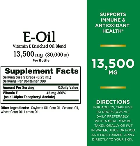 Pure enough to take orally or apply directly to your skin, Nature’s Bounty Vitamin E Oil provides the antioxidant and immune support you need to look and feel your best. (1) When applied to the skin, Vitamin E can help maintain your skin’s natural moisture, contributing to a radiant, youthful-looking complexion. Taken orally as a Vitamin E supplement, Nature’s Bounty Vitamin E Oil supports your immune system and antioxidant health. (1) For use as an oral supplement, take five drops daily—preferably with a meal. For use as a moisturizer, simply apply directly to your skin. Nature’s Bounty Vitamin E Oil is suitable for vegetarians and free of artificial colors, flavors and sweeteners. Each 2.5 oz bottle contains 13,500 mg (30,000IU) of Vitamin E.