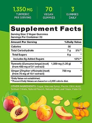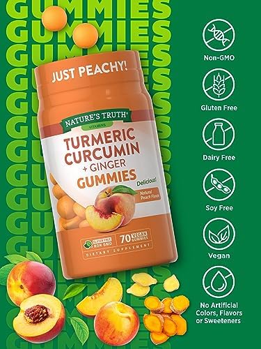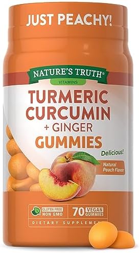 Bursting with a subtle, naturally delicious peach flavor, Nature’s Truth Turmeric Curcumin gummies deliver 450mg of Turmeric Extract per serving plus 75mg Ginger Extract for added support. Our great-tasting gummies are vegan, gluten-free, non GMO and created without any artificial flavors so you can feel good adding them into your daily routine. Make life a little sweeter with Nature’s Truth!