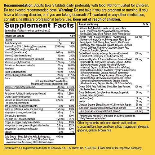 Max potency multivitamin to support daily energy metabolism.* Whole body nutrition with high potency B-vitamins including the active form of B-12 and folate. Supports eye health, bone health, heart health, immune health, skin health, and energy metabolism.* With food-based powder blends including Daily Greens, Orchard Fruits & Garden Veggies, Cardio, Digestive Enzyme, and more blends. Gluten-free. No artificial colors.