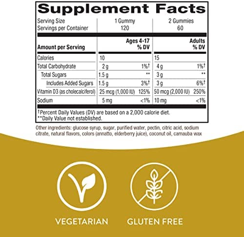 Vitamin D3, the active and preferred form of vitamin D, is essential for good health but is also a key player in supporting proper immune function.* Support your immune system and healthy bones with these great tasting, high potency gummies, formulated with 250% DV of vitamin D3 per 2 gummy serving.* Theyre like little drops of sunshine in a jar!.