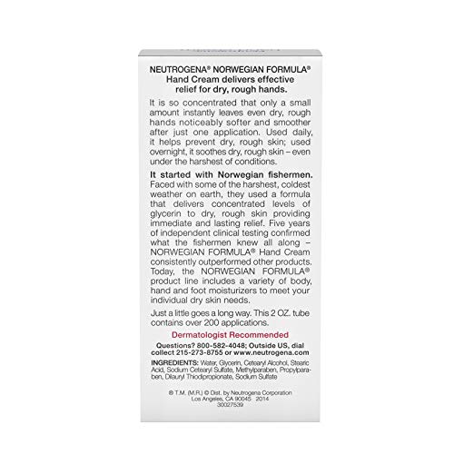 Relieve dry skin effectively with Neutrogena Norwegian Formula Hand Cream. Featuring a highly concentrated Norwegian formula, this moisturizing hand lotion has been clinically proven to provide immediate and lasting relief for dry, rough hands. Rich in glycerin, this intensive hand cream is long-lasting and helps improve the look and feel of dry skin, leaving it noticeably softer and smoother. This hand moisturizing hand lotion is fragrance-free and is so concentrated that only a small amount is needed, with over 200 applications contained in each 2-ounce tube.