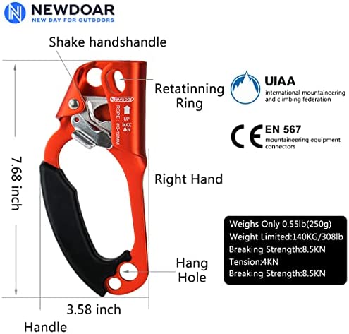 [Light weight hand ascender]:The aluminum alloy frame is light yet durable,Weighs only 0.52 lbs (237g),Weight limited:140kg/ 308Ib,Breaking strength8.5KN.Tension:4KN,Breaking strength8.5KN.