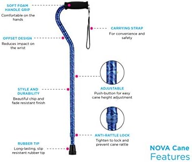 NOVA Designer Walking Cane with Offset Handle, Lightweight Adjustable Walking Stick with Carrying Strap