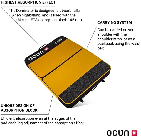 The Dominator is designed to absorb falls when bouldering. It is filled with the thickest FTS absorption block (145 mm) and equipped with carrying handles, a padded waist belt and shoulder straps to easily transport.