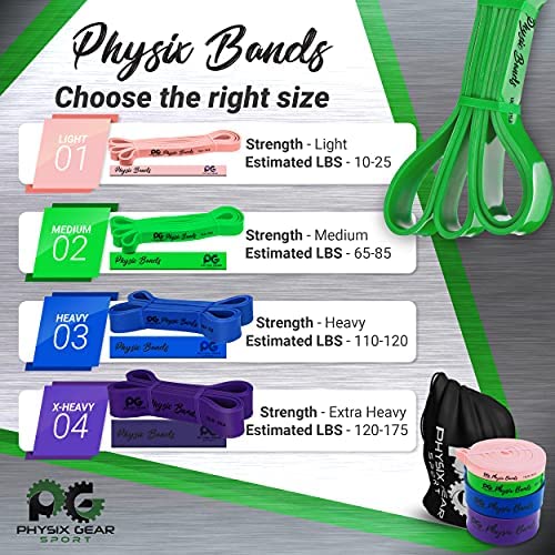 Whether you’re at home or on the road, Physix Gear Sport Resistance Bands for Pullups are the perfect way to get a whole body workout in less than 20 minutes! Choose the right resistance band pull up for you from a variety of colors & resistance strength options: FITNESS BANDS RESISTANCE MEN/WOMEN STRENGTH LEVELS (W/ INDIVIDUAL CARRY CASE): PINK (Lightest) 10lbs-25lbs (4.5kg -11kg) – Stretching & Mobility Exercises | GREEN (Medium) 65lbs-85lbs (29kg -38.5kg) – Light Resistance Training (Arm Curl, Shoulder Press, pushups) | BLUE (Strong) 110lbs-120lbs (49kg-54kg) – Resistance Training (Squats, Deadlift, Upright Row) | PURPLE (Strongest) 120lbs-175lbs (54kg-79k) – Pull Up Assist (All Colors available depending on Strength Level). Choosing the right pull up assistance band depends on your level of strength & weight. Check our Pull Up & Exercise guides in the photos section if unsure which calisthenics resistance bands to purchase. Order single bands or a 4-pack pull up assistance bands set, from the lightest to heaviest resistance bands. You can purchase multiple workout bands pull up of the same or different sizes! Increase your strength & build muscle w/ our resistance bands mens heavy duty from a range of push up assistance band sizes & exercise options for all ages & muscle groups. Our pull up bands assistance bands come in a portable carry case so you can use them at home, in the gym, or on the go! All our resistance bands for pull ups are made of 100% Durable Natural Latex. These are sturdy, heavy duty workout bands that you can trust to pull you up without breaking! Every assisted pull up resistance band is ideal for injury rehabilitation & improved mobility to supplement Physical Therapy. Plus, all purchases of Physix large resistance bands come with a downloadable video guide! TAGS: heavy bands, resistance bands heavy, bulk resistance bands, resistant bands for exercise men, resistance bands for men heavy duty, workiut bands, pull up bar bands assist se