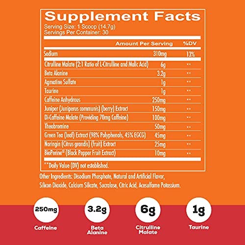 Citrune Malate, Beta-Alanine, Agmatine Sulfate, Taurine, Caffeine Anhydrous, Ampiblast, Di-Caffeine Malate, Cocophenals, Naringin, BioPerine
