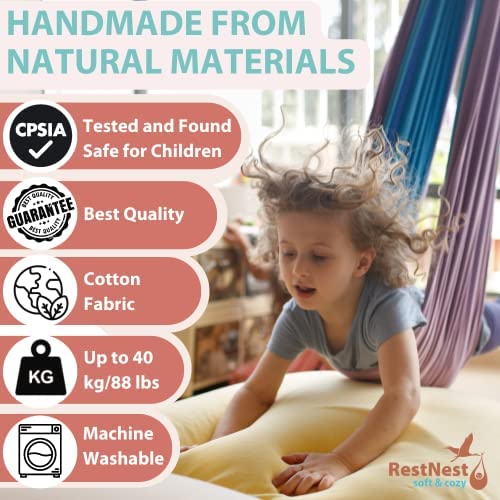 TOP GRADE QUALITY AND SUPER SAFE. This swing is handmade from natural materials. The 2-layer cotton fabric is soft, stretchy, super thick, strong, long lasting and pleasant to the touch – unlike any of the mass produced swings. It comes pre-assembled and with the hardware required for secure hanging. The swing has been certified for compliance with the CPSIA toy safety standard.