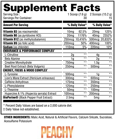 Vtiamin B3 10mg, Vtiamin B6 20mg, Vitamin B12 250mcg, Vitamin B9 200mcg, Sodium 110mg, L-Citrulline 2g, Beta Alanine 1g, Kre-Alkalyn 375mg, Beet Root Extract 250mg, L-Tyrosine 500mg, Lion’s Mane Extract 300mg, Caffeine Anhydrous 175mg, L-Phenylalanine 125mg, L-Theanine 50mg, Huperzine A 100mcg, BioPerine 2.5mg OTHER INGREDIENTS: Malic Acid, Natural & Artificial, Calcium Silicate, Sucralose, Acesulfame Potassium, FD&C Red #40