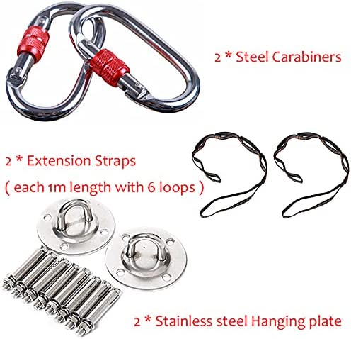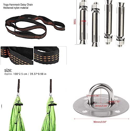 Package included:1x Yoga Hammock(5*2.8m /L*W),2x O-Ring,2x daisy chains for extending(105cm*1.5cm),2 x Steel anchors for ceiling,8 x Mount screws