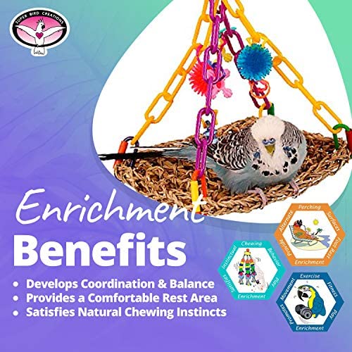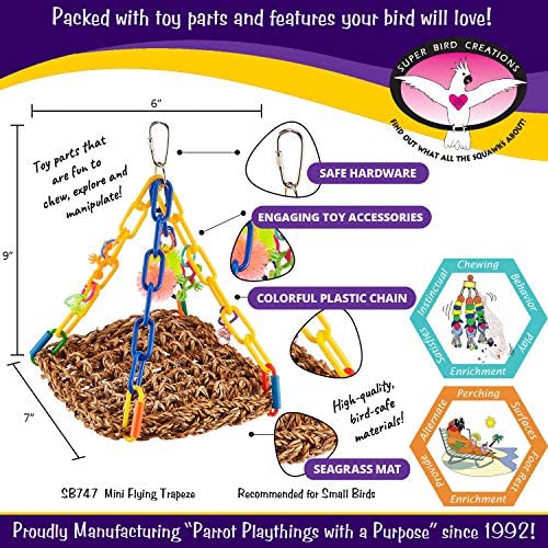 DESIGN FEATURES – This bird toy is crafted with a seagrass mat suspended by colorful plastic chain decorated with fun to explore toy parts. Utilizing a diverse selection of stimulating materials, colors, textures and shapes make Super Bird Creations toys of maximum interest to pet birds.