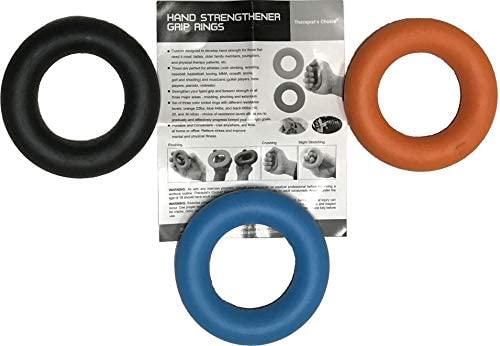 Therapist’s Choice Grip Rings, 3 resistance rings per package. Orange 22lbs, Blue 44lbs, Black 66lbs resistance. Includes basic manual Can be used for crushing, pinching and even extension, with equally amazing results. Package includes 22lb, 44lb and 66lb grip rings. Perfect for Sports such as Tennis, Basketball, Boxing, crossfit and especially rock climbing can benefit from better grip strength. The rings are lightweight and easily portable.