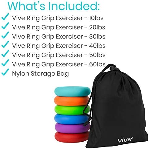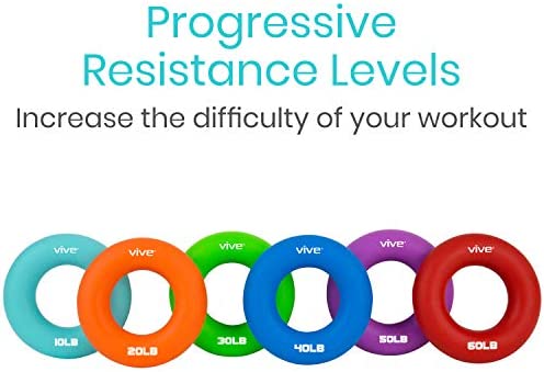 PROGRESSIVE RESISTANCE LEVELS: Progressive levels of resistance allows the difficulty of each workout to be gradually increased as your grip improves. The color coded set includes 10 lb, 20 lb, 30 lb. 40 lb, 50 lb, 60 lb rings which can also be used for effective interval training, alternating between the three resistance levels in a single workout.